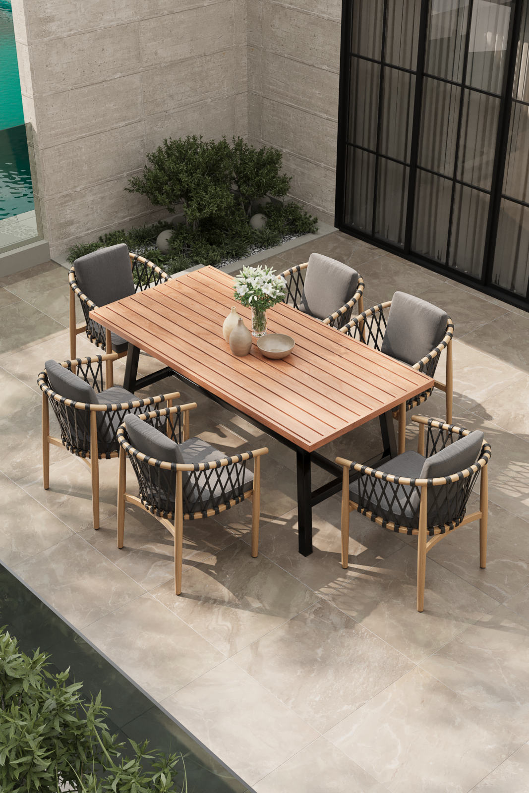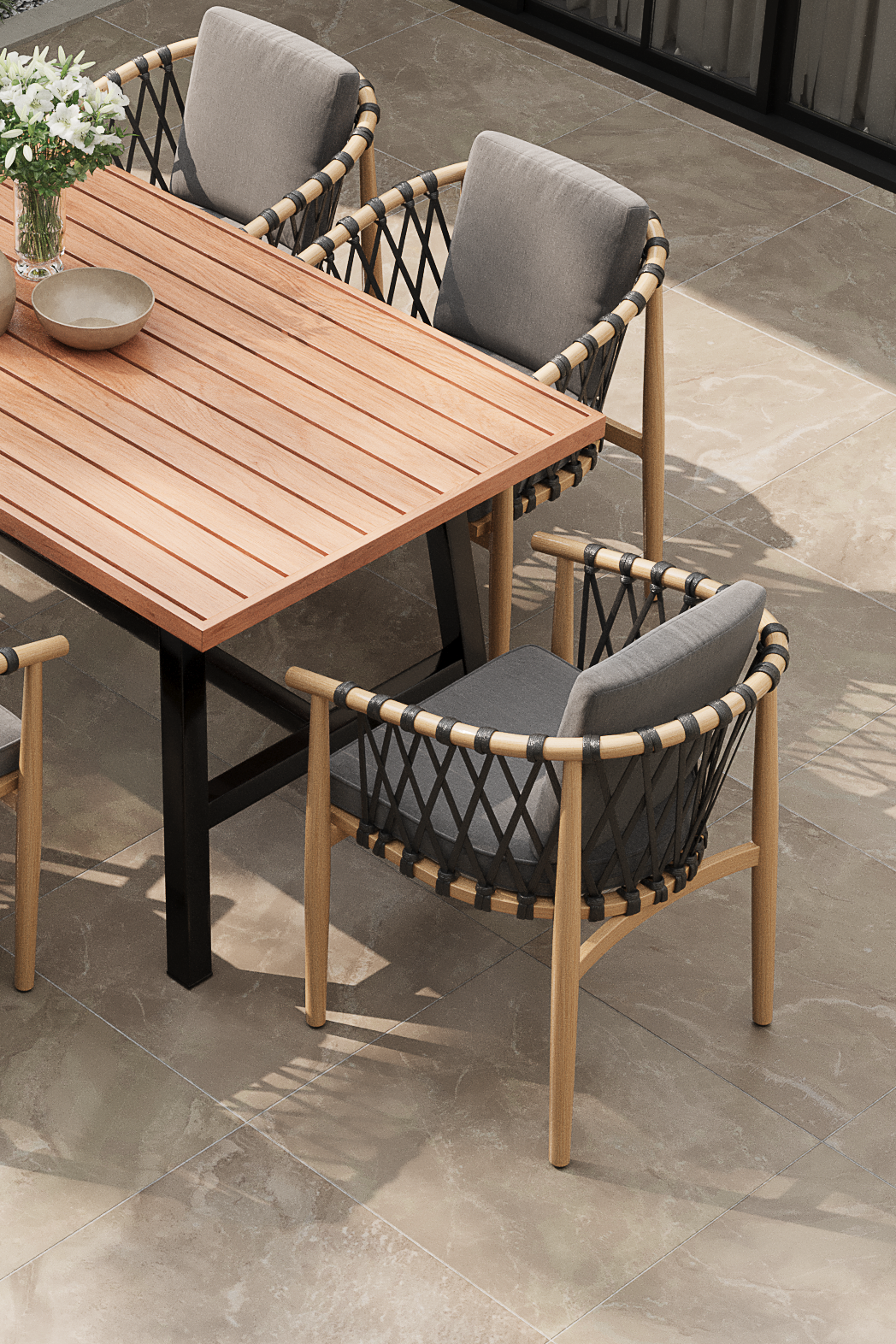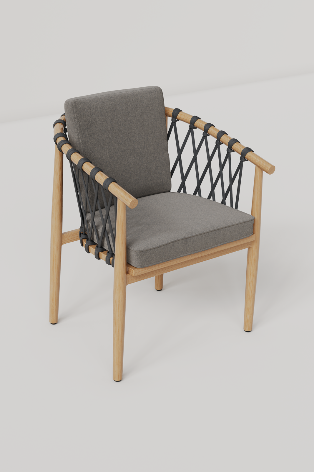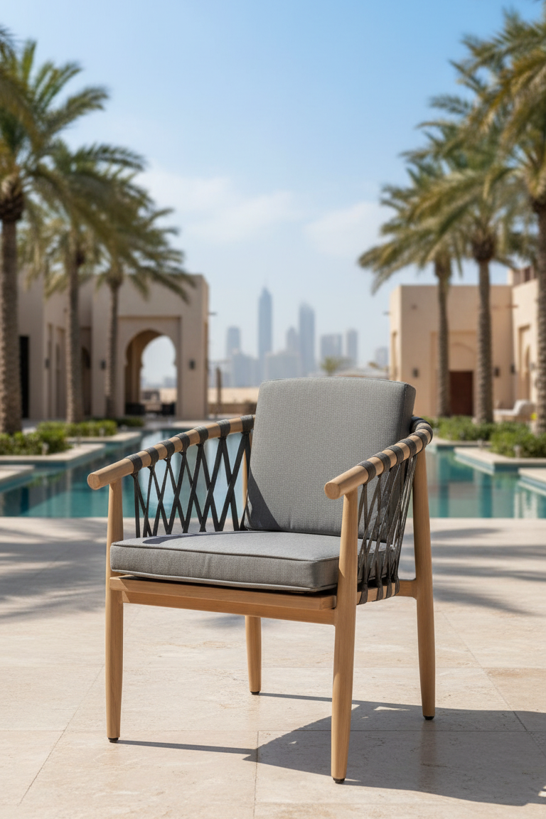 The Madden Grey Outdoor Dining Chair is designed for modern comfort and stylish seating. It features a rope-weave backrest with a natural wood frame and soft cushions. Ideal for Dubai patios, balconies, and dining spaces.